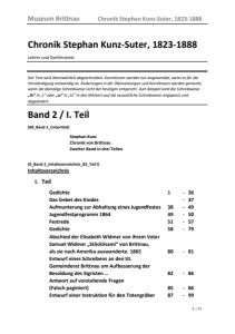 Museum Brittnau Chronik Stephan Kunz-Suter, 1823-1888 2 | 43 Gedichte (B2_T1_S.001) 1. Sehnsucht nach der Heimat. 1. Ich möchte heim ins liebe Dörfchen, Wo ich als Kind umher gehüpft Wo och in manchem frohen Stündchen Manch Blumensträusschen hab gepflückt. 2. Ich möchte heim zu meinen Lieben, Zu Eltern und Geschwistern gehen. O wäre ich daheim geblieben, Dann könnte ich sie täglich sehn. 3. Ich möchte heim zu den Gespielen, Möchte droben auf dem Kührain stehn. Mit den Freunden möchte ich spielen Möchte ins Dorf hinunter sehn. 4. Ich möchte heim, weil ich am Abend, So gern ein Pfeifchen Taback rauch. Wenn vor dem Hause sich erlabend, Der Nachbar sitzt nach Landesbrauch. ---------------------------------------------------------------------------------- (B2_T1_S.002) 2. Liebesbekenntnis 1. In des Herzens tiefstem Grunde Lodert hoch zu jeder Stunde Meiner Liebe heisse Glut, Und bestärkt den sachwachen Mut. In der Liebe Arm sich wiegen,$ Und an deine Brust sich schmiegen, Ist ein grosses sel‘ges Glück, Kehre oft und bald zurück. 2. Deiner Augen klarer Sterne Leuchten mir aus weiter Ferne, Und dein schöner Rosenmund, tut mir deine Treue kund. Möchte dich bald wieder sehen, Und in deiner Nähe stehen: Schmiegen mich an deinen Brust, Küsste dich nach Herzenslust. ----------------------------------------------------------------------------------