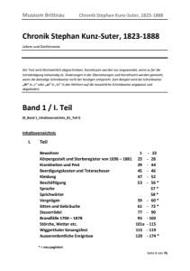 Museum Brittnau Chronik Stephan Kunz-Suter, 1823-1888 Seite 1 von 76 Chronik Stephan Kunz-Suter, 1823-1888 Lehrer und Dorfchronist Der Text wird Wortwörtlich abgeschrieben. Korrekturen werden nur angewendet, wenn es für die Verständigung notwendig ist. Änderungen in der Übersetzungen und Korrekturen werden gemacht, wenn die damalige Schreibweise nicht der heutigen entspricht. Zum Beispiel wird die Schreibweise „th“ in „t“ oder „zz“ in „tz“ in den Wörtern auf die neuzeitliche Schreibweise angepasst und abgeändert. Band 1 / I. Teil (0_Band 1_Inhaltsverzeichnis_B1_Teil I) Inhaltsverzeichnis I. Teil Bewohner 1 - 22 Körpergestalt und Sterberegister von 1696 – 1881 23 - 28 Krankheiten und Pest 29 - 44 Beerdigungskosten und Totenschauer 45 - 46 Kleidung 47 - 52 Beschäftigung 53 - 56* Sprache 57 * Sprichwörter 58 * Vergnügen 59 - 60* Sitten und Gebräuche 61 - 72* Steuerrödel 77 - 90 Brandfälle 1704 – 1878 95 - 102 Störche, Wetter etc. 101a - 115 Wiggerthaler Gesangsfest 115 - 119 Ausserordentliche Ereignisse 120 - 174 * * = neu paginiert